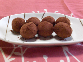 | <作り方> 1.リブレフラワーとココアパウダー、塩を入れよく混ざるようにかき混ぜて、熱湯を入れながら木べらで混ぜていく。 少し練ってから、きっちりとフタをして、5分くらい蒸らす。 2.くるみをオーブンで熱し、粗みじんに切る。@にメープルシロップ、くるみを入れ混ぜて、2cm位の大きさに丸め、 ココアパウダー(飾り分)を茶こしでふるいながら全体にまぶして出来上がり。 |