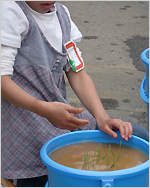![]() 子どもたちと一種に田植え初体験! さあ、出来栄えは・・・ |