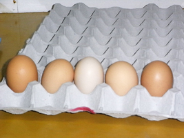 会津地鶏は一般的なニワトリに比べると大ぶり、 純系はチャボより一回り大きいくらい。 羽の色も黒っぽいもの、薄い茶色、白っぽいのと いろいろ。 顔もいろいろ。 |